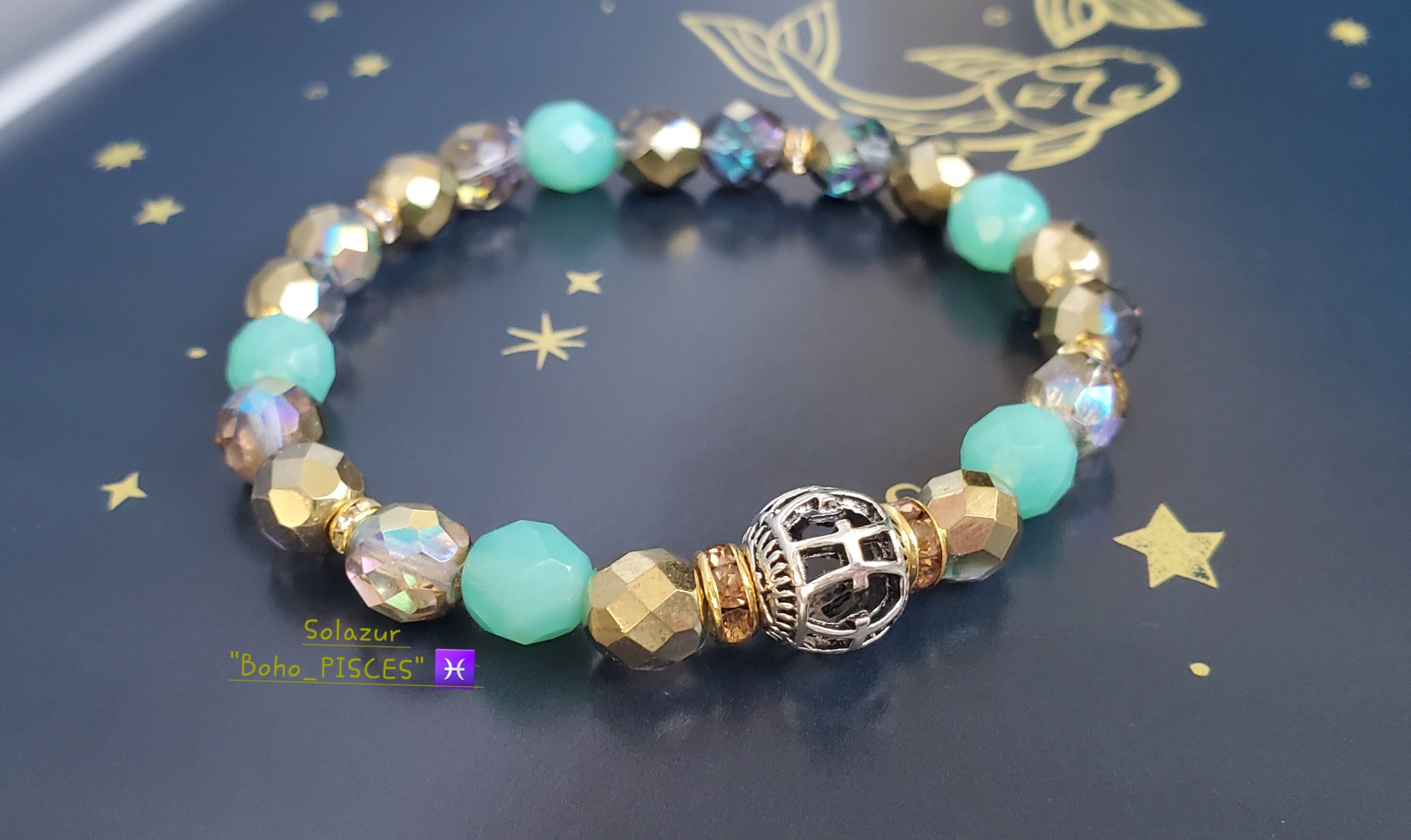 Bracelet is made with one metal Zodiac bead of your choice, European made glass beads in golden coating and minty green and gold plated accent beads. On durable high quality stretch cord.