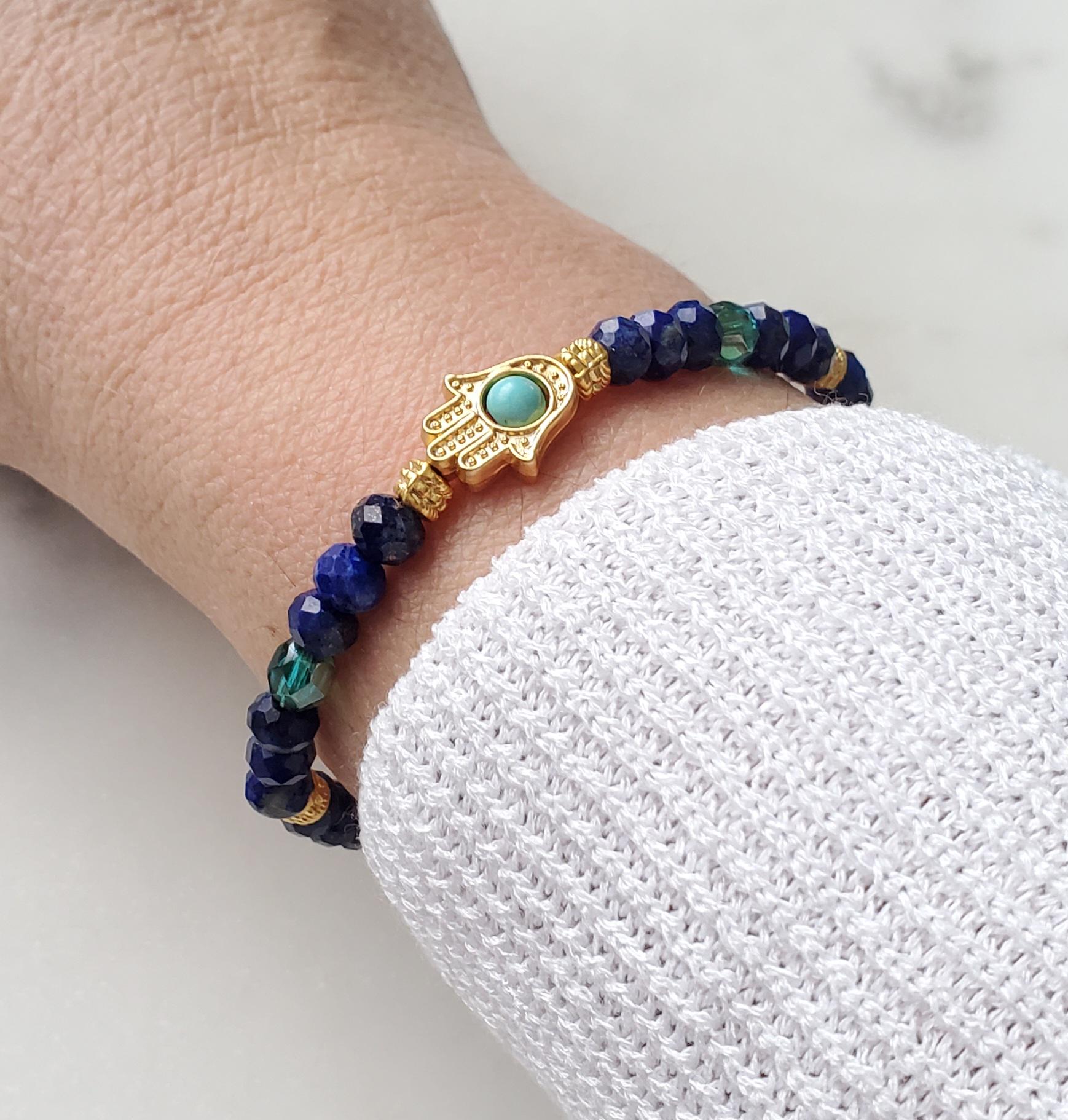 Bracelet is made with Lapis Lazuli, 24k gold plated Hamsa hand and beads and quality crystal.